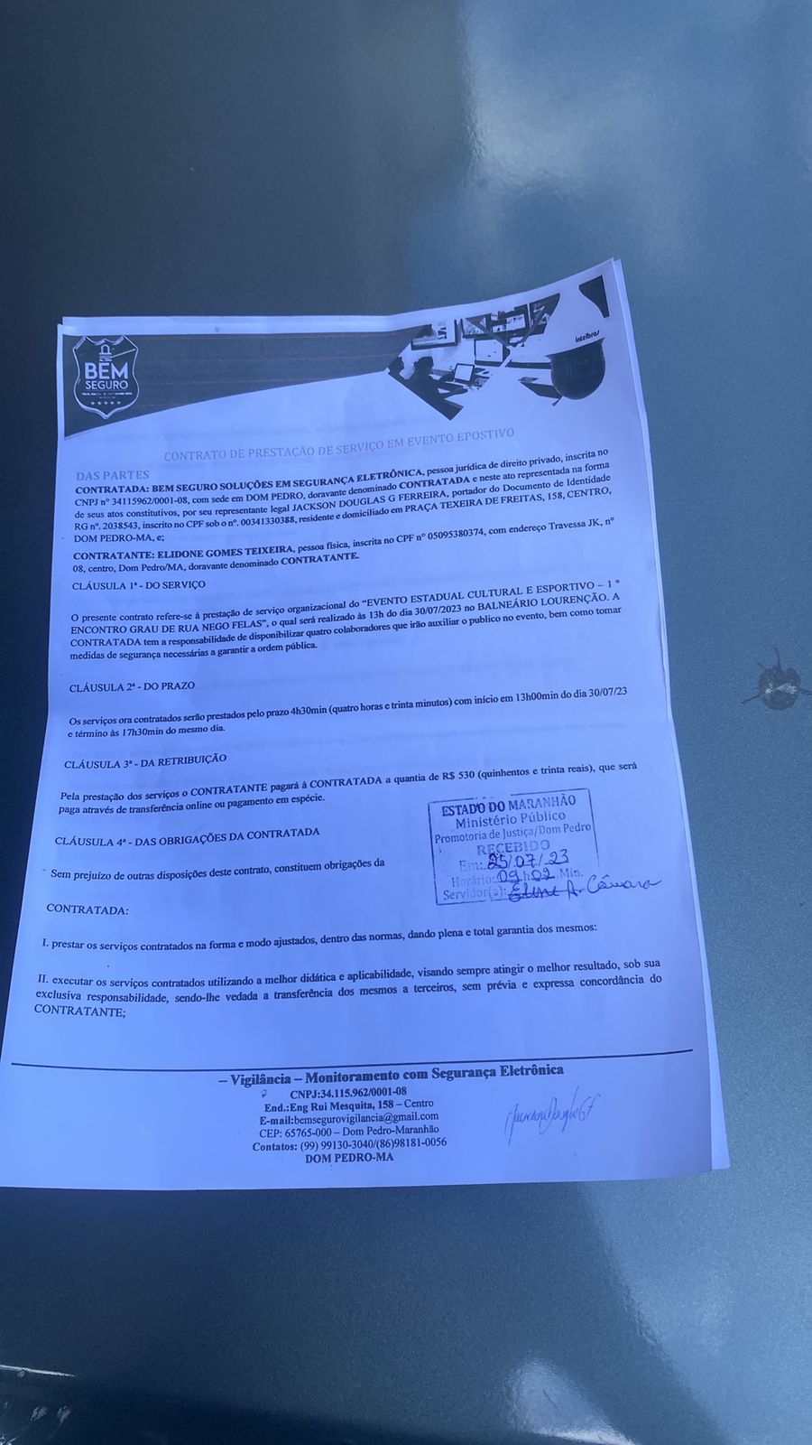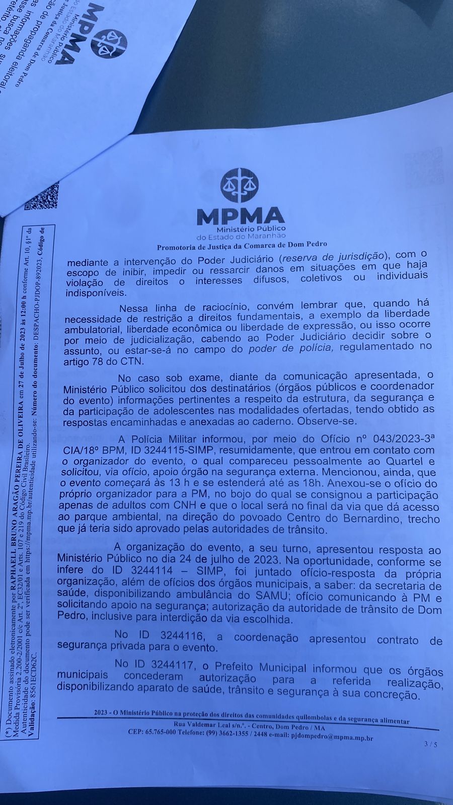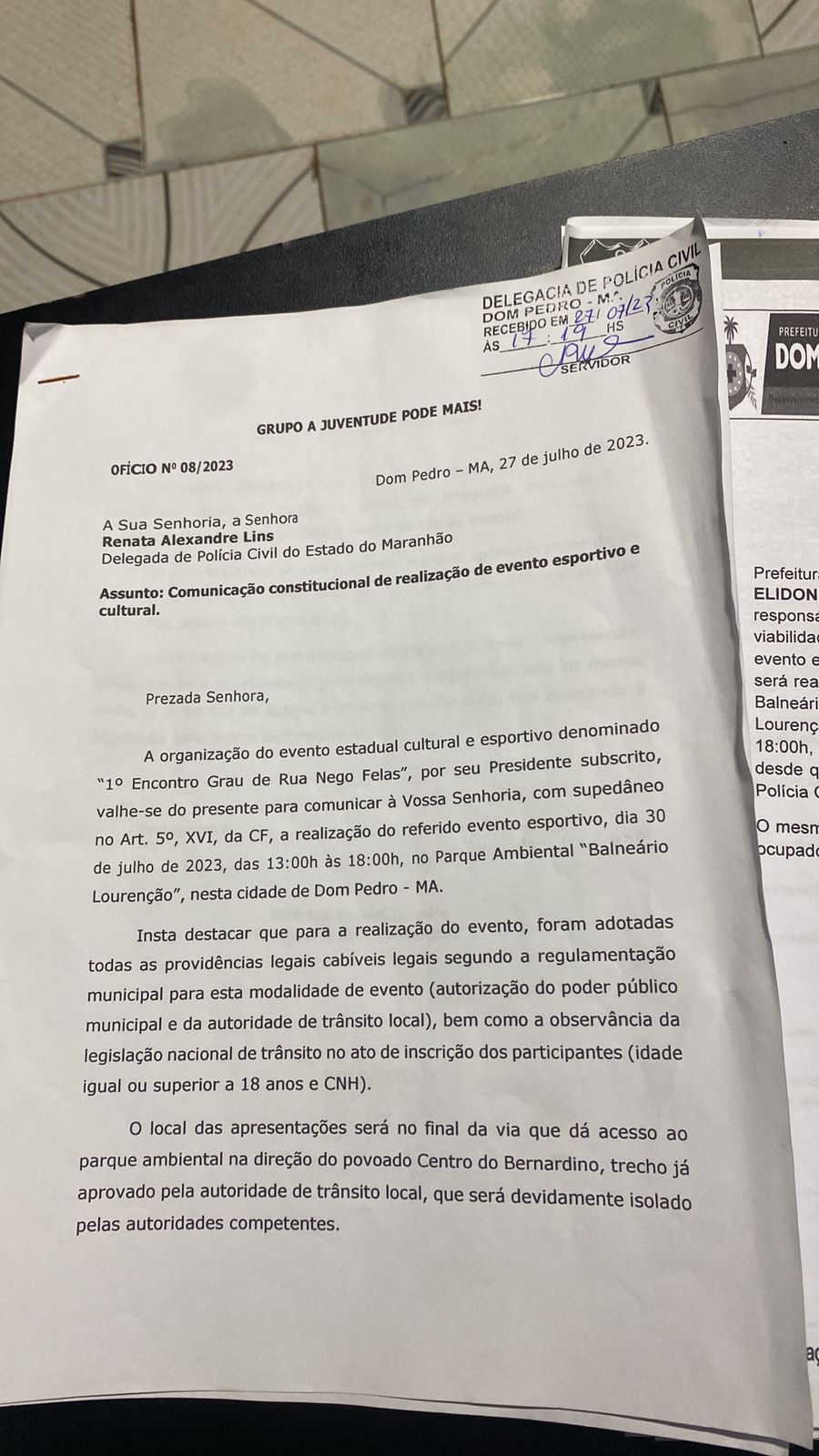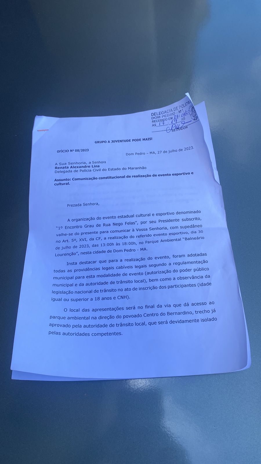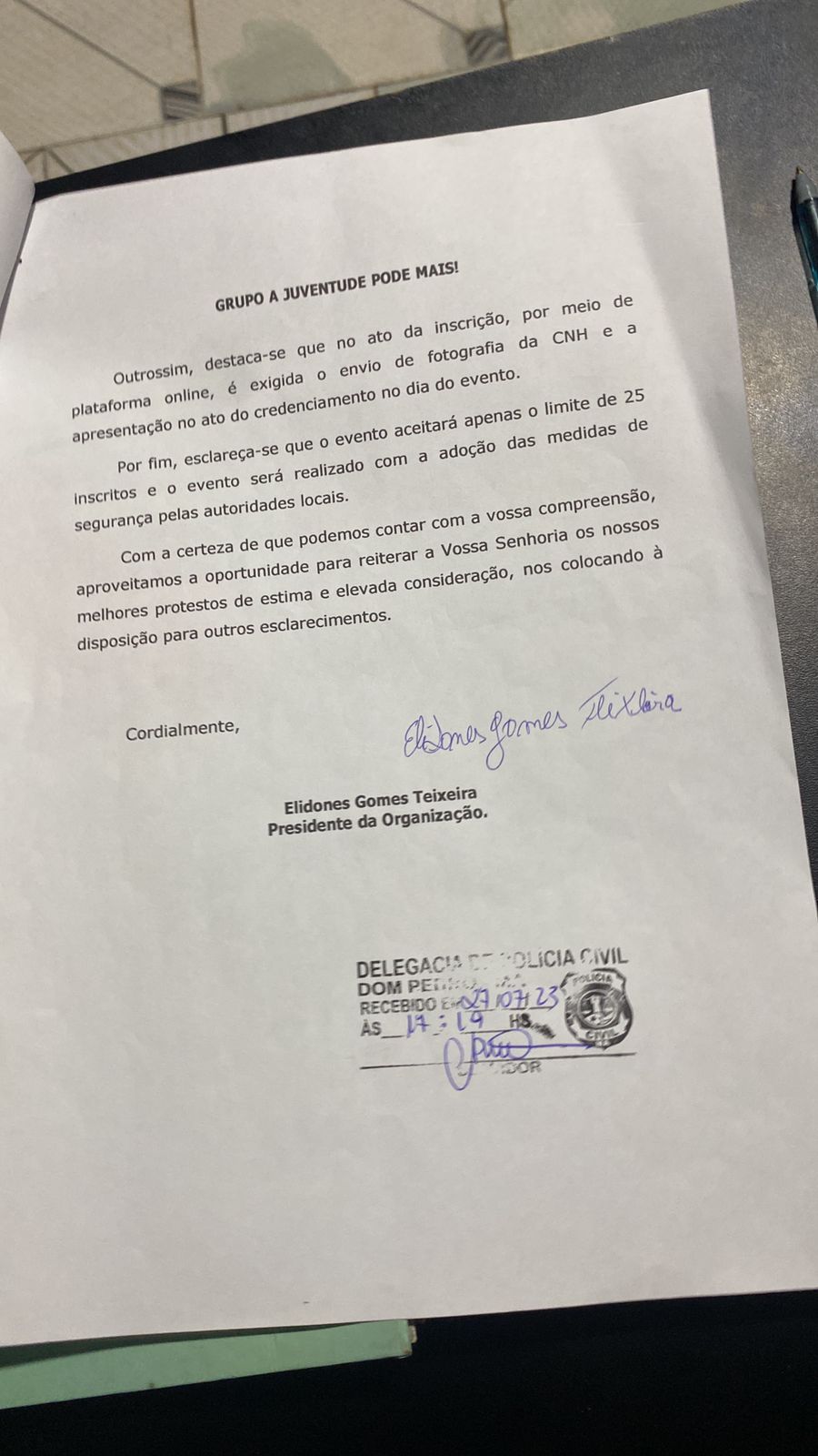 Quanto à documentação que o organizador alega ter entregue delegacia, ela escreveu o seguinte: “Apenas no dia 27.07.2023, às 17:19, ou seja, próximo ao final do expediente da semana, tendo em vista que dia 28.07.2023 foi feriado, o organizador encaminhou o ofício de n° 08/2023 (em anexo), apenas informando a realização do evento, em que pese já ter sido advertido quanto à necessidade de expedição de licença pela Autoridade Policial, o que inviabilizou qualquer organização por parte desta signatária quando a organização da segurança pública para guarnecer o evento”, disse a delegada no ofício.