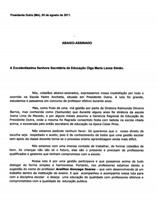 Na tarde desta última sexta-feira o blogue do jornalista Luis Cardoso publicou cópia de um abaixo assinado supostamente assinado por professores Unidade Estadual de Educação Padre Anchieta, o Colégio Bandeirantes como é mais conhecido sugerindo o nome do professor Aceilton Gonzaga Soares para o cargo de diretor. Segundo alguns professores, o teor do documento foi redigido com o intúito de “derrubar” a nomeação já certa da professora Samunda. Como Mentira tem pernas curtas, na manhã deste sábado os professores que aparecem na lista procuraram este blogue para denunciar a farsa afirmando que nunca assinaram nenhum abaixo assinado sugerindo do nome de Aceilton para a direção da escola e estão ameaçando ameaçando ir à justiça para que o responsável ou os responsáveis respondam por seus atos.