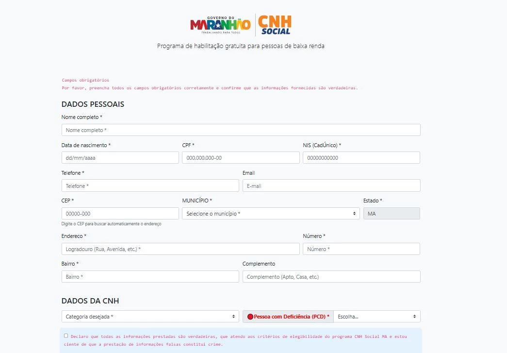Estão abertas as inscrições gratuitas do Programa CNH Social no Maranhão. Os interessados devem preencher um formulário eletrônico disponível no site oficial do Programa CNH Social (cnhsocial.detran.ma.gov.br). O período de inscrições será de 3 de outubro a 22 de outubro de 2025 e somente on-line.