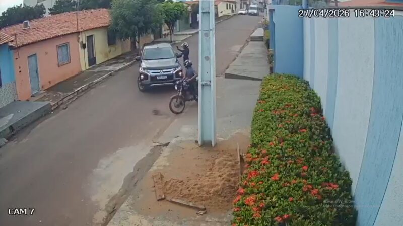 Imagens de câmeras de segurança mostram o exato momento em que dois homens descem de uma moto e atiram várias vezes no ex-vereador Farys Miguel na tarde desta segunda-feira 27 de abril de 2026.