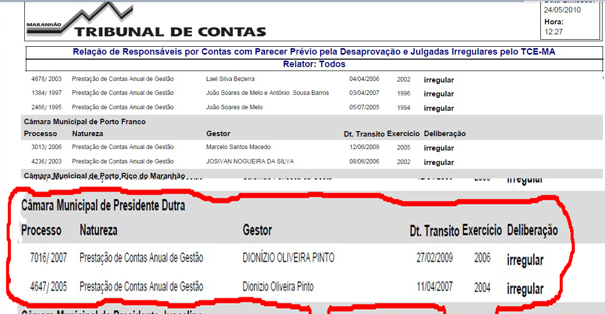 O ex-presidente da Câmara Municipal de Presidente Dutra por dois mandatos e atual vereador pelo PRB Dionízio Oliveira Pinto corre sério risco de não disputar uma das vagas à Câmara nas eleições deste ano. Em parecer prévio, o Tribunal de Contas do Estado (TCE) julgou irregulares as prestações de contas referentes aos anos 2004 e 2006 época em que Dionízio Oliveira Pinto foi Presidente da Câmara Municipal de Presidente Dutra. Com a aplicação da Lei da Ficha Limpa para as eleições deste ano aprovada pelo Supremo, gestores com contas irregulares não podem concorrer a cargos públicos. Como diz o documento abaixo, é um parecer prévio pela desaprovação, caberá ao Ministério Público decidir se entra ou não com ação civil contra ex-gestores nesta situação.