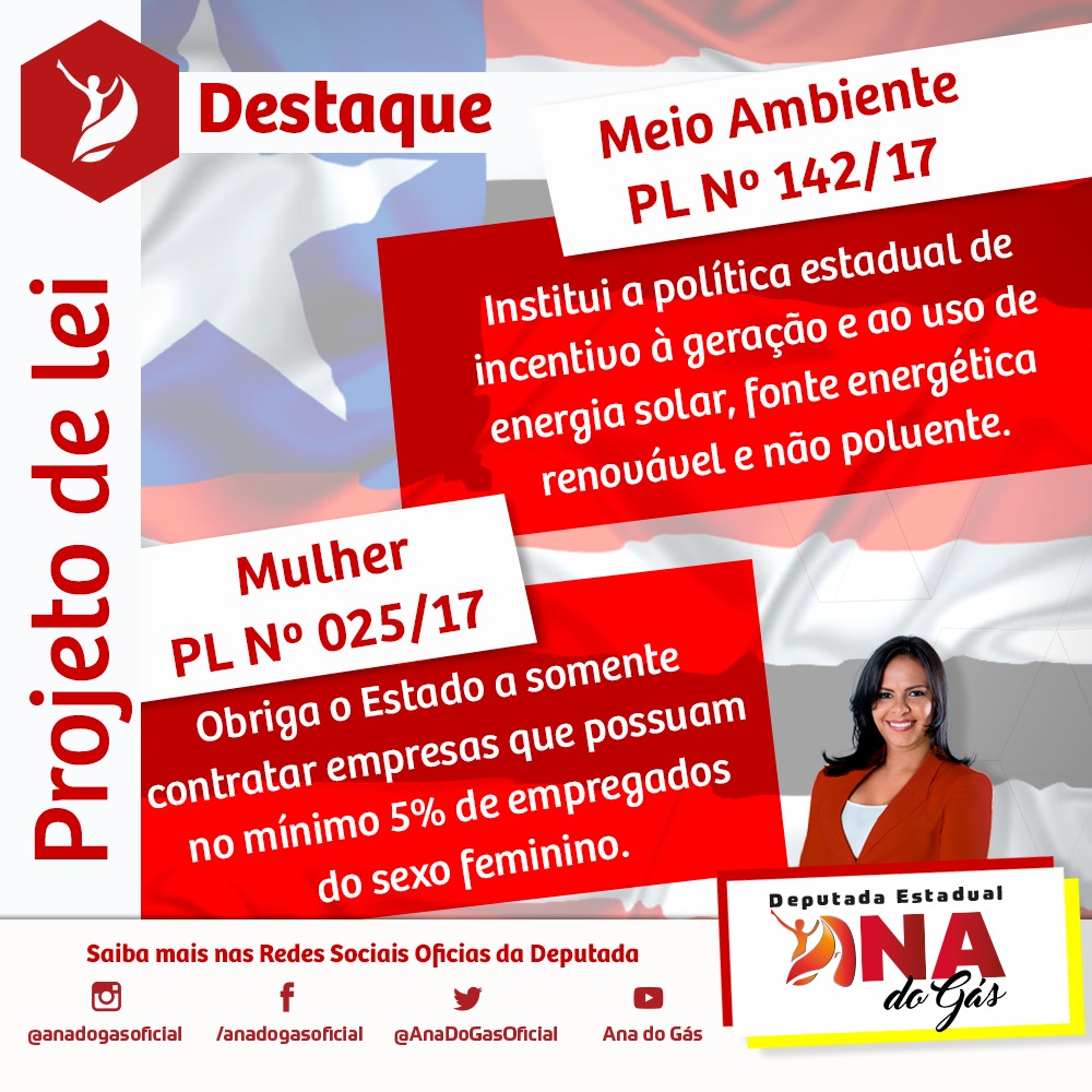 A deputada estadual Ana do Gás vem trabalhando na Assembleia Legislativa em 16 Projetos de Lei que propôs ao longo dos primeiros dois anos e oito meses de mandato e que contemplam os mais variados segmentos da sociedade como mulheres, idosos, crianças, estudantes, dentre outros. E dois projetos que merecem destaque são o que obriga o Estado do Maranhão a somente contratar empresas que possuam no mínimo 5% (cinco por cento) de empregados do sexo feminino no seu quadro profissional, independente das funções a serem exercidas e um outro projeto bastante especial, que se mobiliza em torno de sustentabilidade para o planeta, instituindo a política estadual de incentivo à geração e ao uso de energia solar, fonte energética renovável e não poluente.
