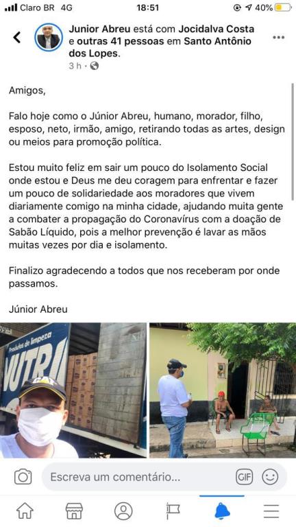 Circula nas redes sociais o gesto grandioso que o vereador de Santo Antônio dos Lopes, Júnior Abreu (PC do B) fez para os conterrâneos, sobretudo os mais necessitados. Em sua página no Facebook o jovem parlamentar escreveu a seguinte mensagem: